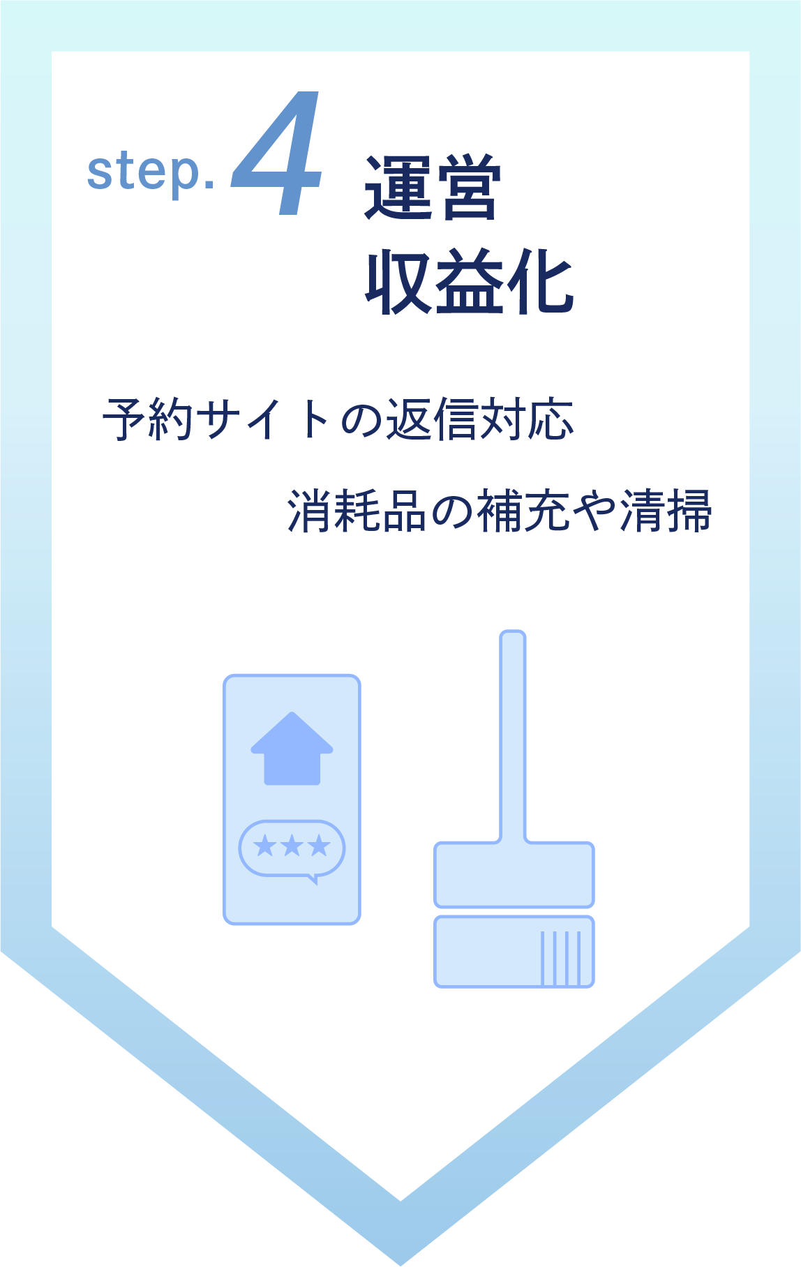 ヒアリング内容をもとに現地調査を行い、民泊に適した物件をご紹介します。エリアの選定だけでなく、将来的な売却相談や再販価値を見据えたご提案をいたします。